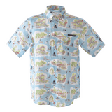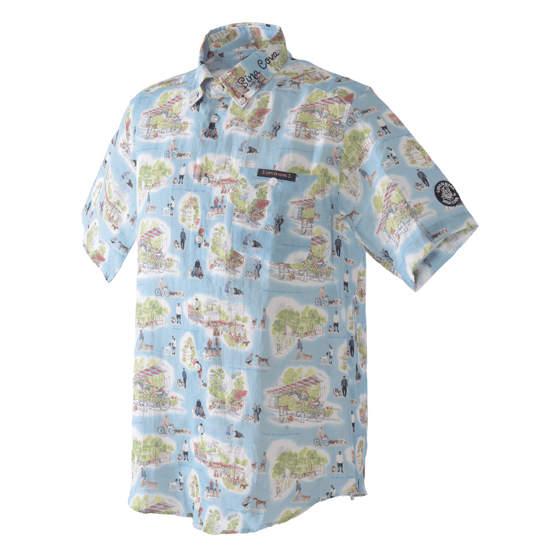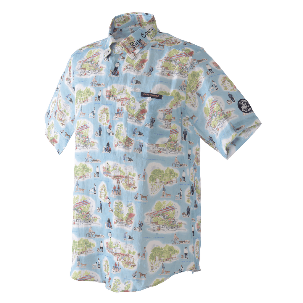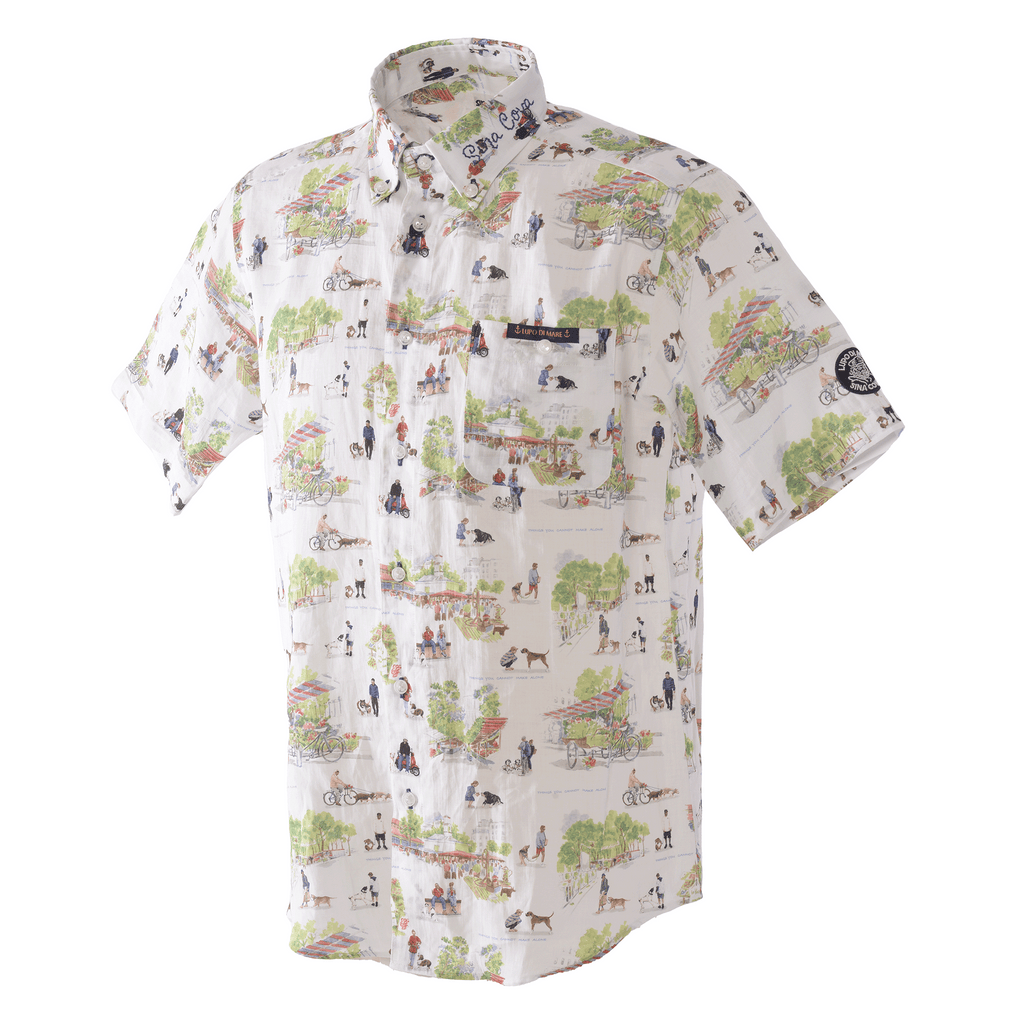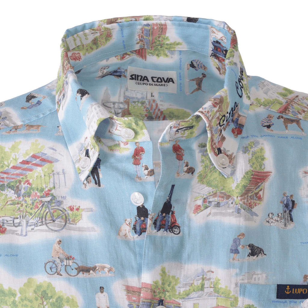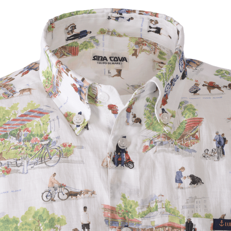 這款 100% 亞麻短袖羈扣襯衫的左領上飾有手繪「SINA COVA」刺繡圖案,全身都是狗狗和市場氛圍的圖案。
